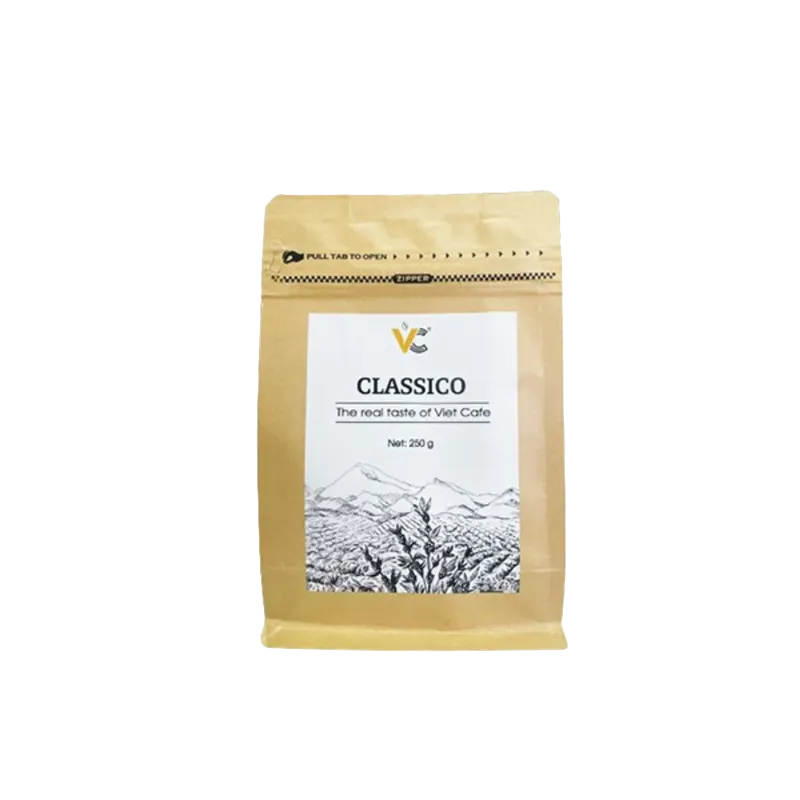 Cafe hạt Vcafe Classico 250g với vị cân bằng trong từng ngụm cà phê. Được pha trộn theo tỉ lệ 60% Arabica Cầu Đất và 40% Robusta Đắk Lắk, Classico mang lại hương vị socola đậm nét, ngọt hậu dễ chịu, vừa tinh tế vừa mạnh mẽ – chuẩn phong cách Ý nhưng vẫn rất gần gũi với gu thưởng thức của người Việt.